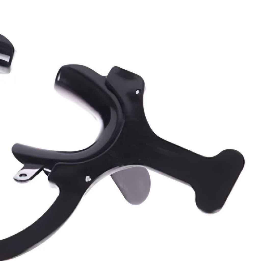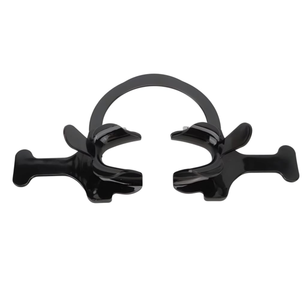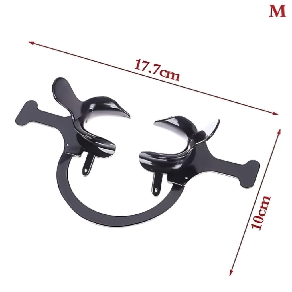 دهان بازکن دو طرفه دستهدار با جنس فلز و روکش مشکی، طول 17.7 سانتیمتر، قابل اتوکلاو و مناسب برای معاینات دندانپزشکی.