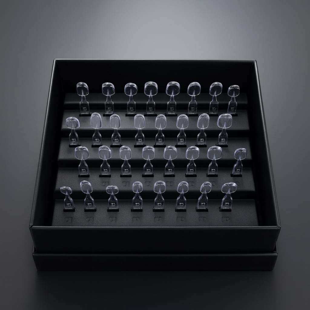 - سایزهای متنوع و کامل: شامل ۴ ست ۸ عددی (Medium/Large برای فک بالا و پایین)، پوششدهنده تمام دندانهای قدامی. نسخه Extra با ۲۴ قالب (XLarge, Large, Medium, Square) برای موارد خاص نیز موجود است.