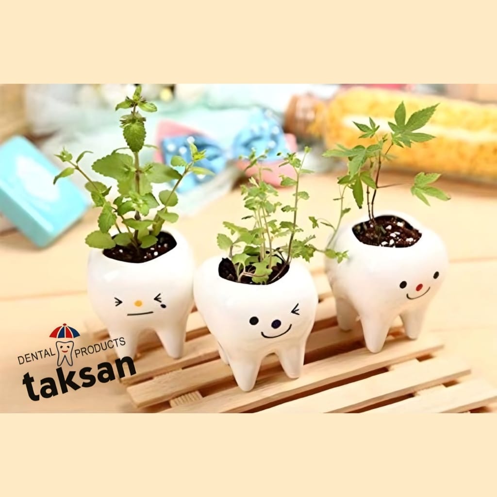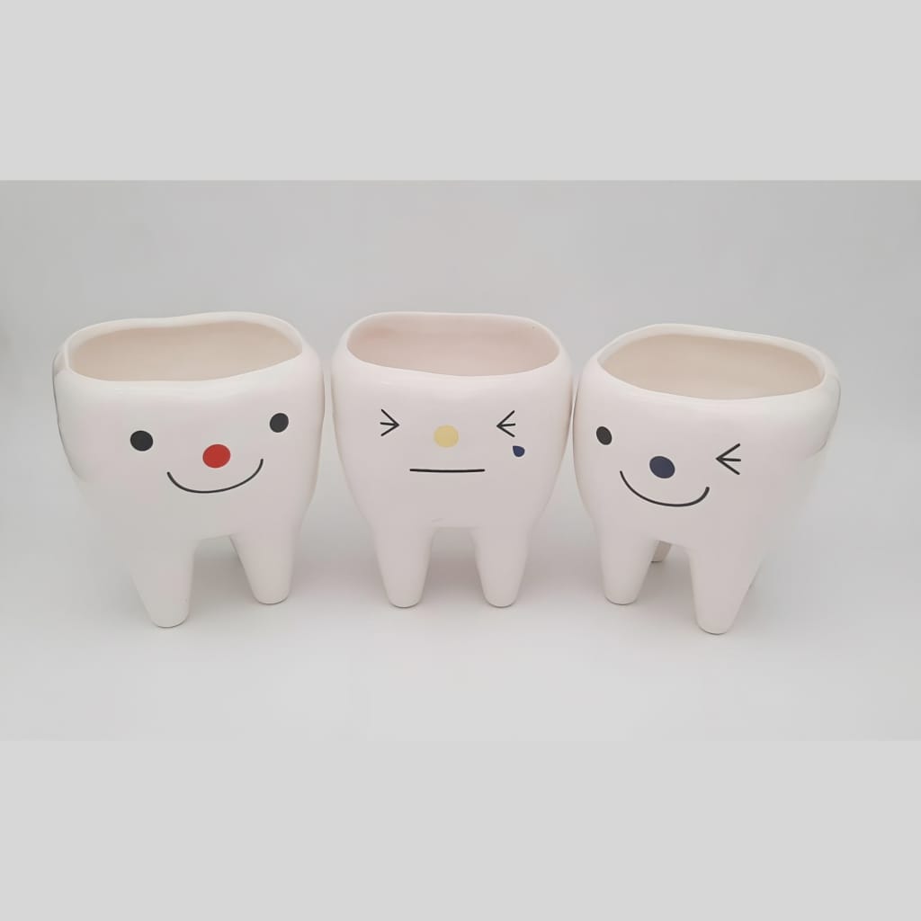 گلدان کوچک طرح دندان سه عددی یک مجموعه منحصر به فرد و جذاب برای دکوراسیون داخلی خانه، دفتر کار یا مطب دندانپزشکی است.