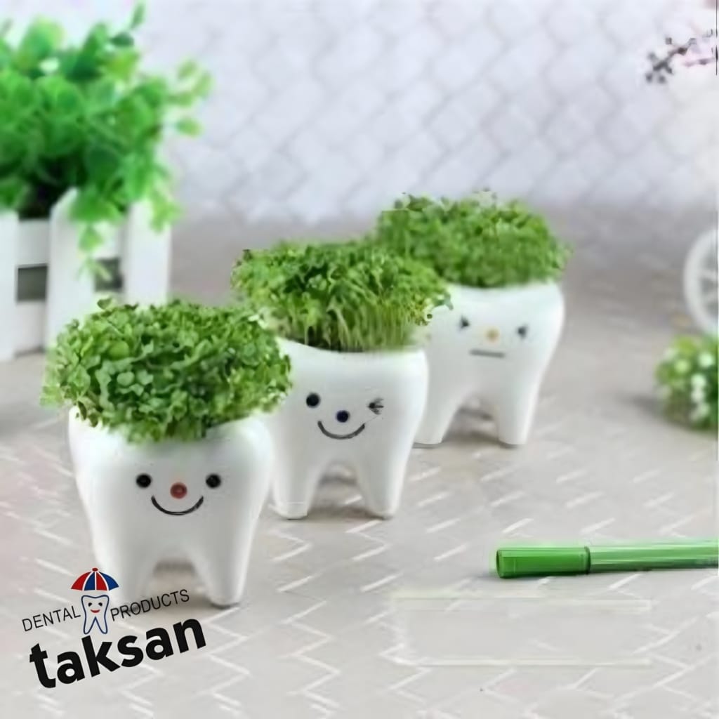 گلدان کوچک طرح دندان سه عددی با طراحی بامزه و سرامیکی، مناسب دکوراسیون خانه و مطب دندانپزشکی. سبک، مقاوم و ایده‌آل برای گیاهان کوچک.ابعاد 5 در 5 در 6/5 سانتیمتر